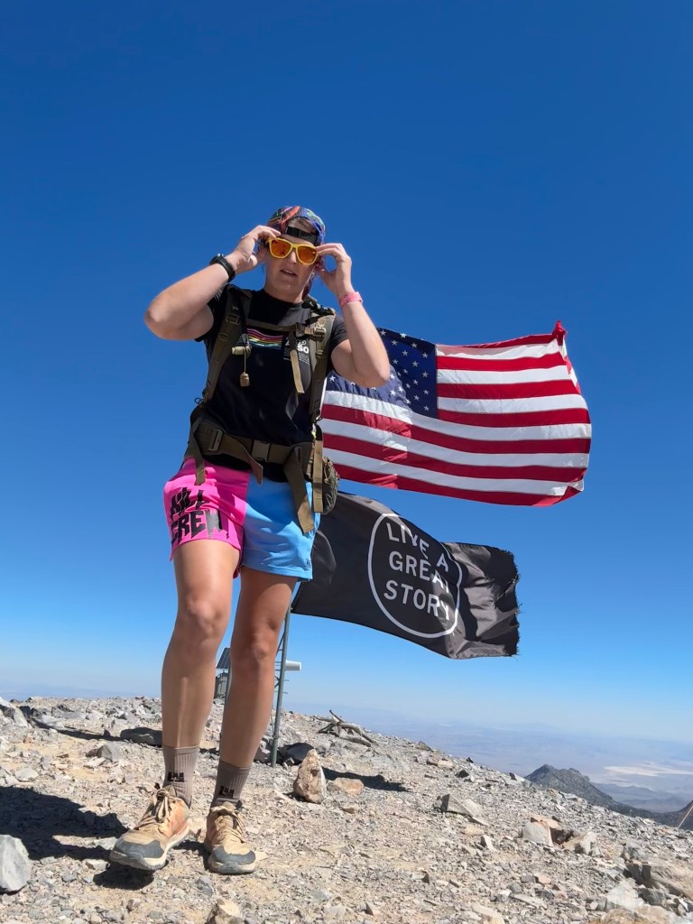 Then I saw it, the climb to the summit. There was less than a mile left of distance to get there. This 3/4 of a mile may as well have been ten. It was hot, exposed, and unforgiving. It took me about 33 minutes and all of my willpower to continue moving and reach the summit. When I did, relief, joy, and solace rushed over me when I saw the flag waving at the top with “Live a Great Story” written across it. I even teared up a bit. This hike was a mental challenge as much as it was physical.