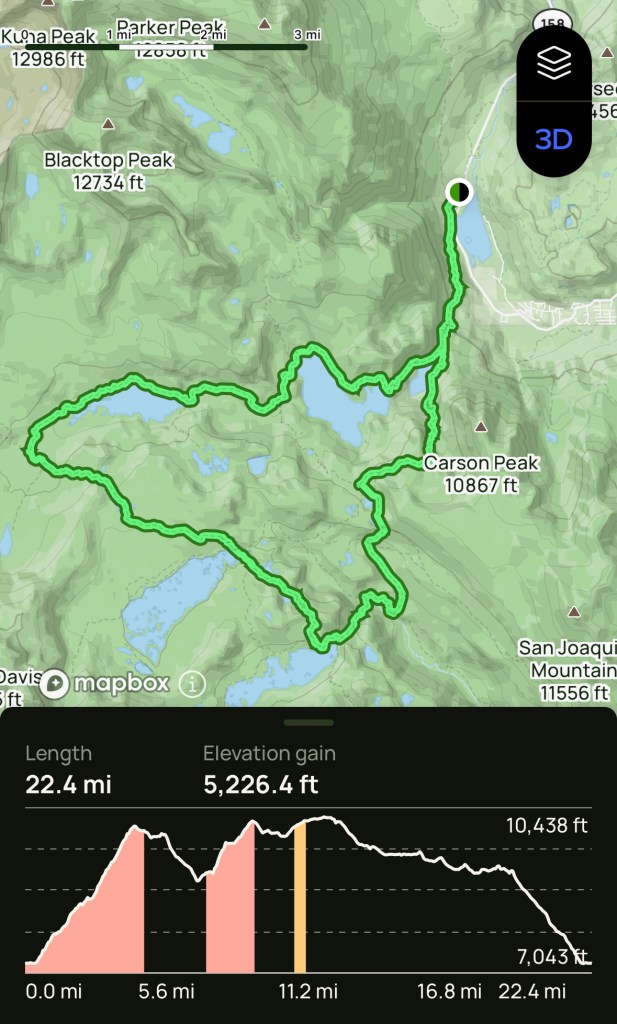 Operation YOSEMITE MAX starts in the June Lake area and takes you through incredible views, including the famous Thousand Island Lake. The mapped route is about 22.5 miles with 5200ft of elevation gain. You reach a little of 10k in altitude, making this course no joke. The difficulty of the course is almost masked by the sheer beauty.
